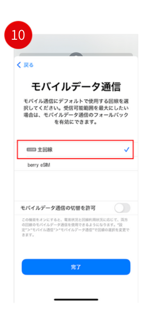 その後、「完了」をタップします。注)「モバイルデータ通信の切替を許可」をONにしてしまうと、データ通信が開始してしまうので、必ずOFFになっていることを確認してください。