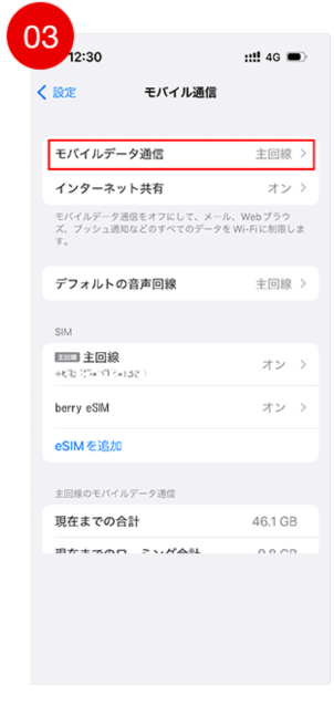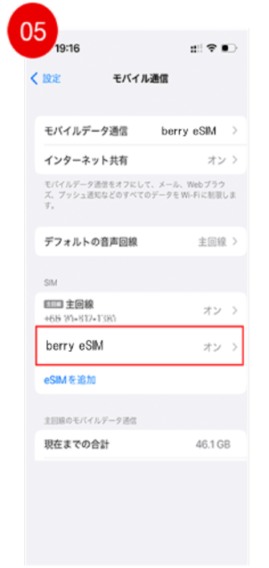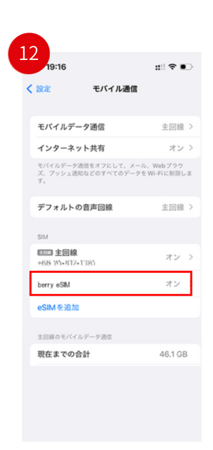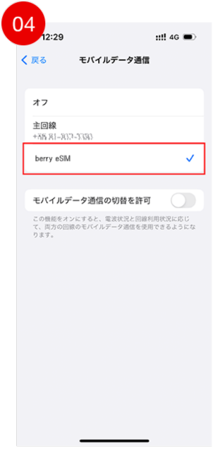 ここでは前コーナーで設定した「berry eSIM」を選択注)「モバイルデータ通信の切替を許可」をONにしてしまうと、メイン回線でローミング使用で高額になってしまう恐れもあるので、必ずOFFになっていることを確認してください。