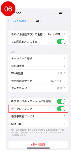 必ずSIMに「ベリーeSIM」が入っていることをご確認ください。この状態になっていれば、準備OKです!AISを選択し、必要に応じて、「モバイルデータ」のON/OFFが切替できます。